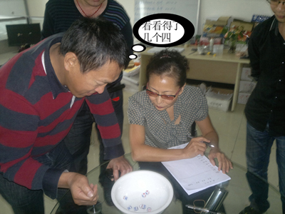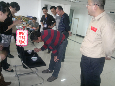 在“筷子夾彈珠”的游戲中,許總在規定的1分鐘時間內夾起了17顆玻璃彈珠,以絕對優勢奪得第一。
