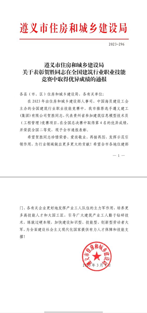 自競賽啟動以來,貴州省住房和城鄉建設廳及(集團)公司領導高度重視,精心組織開展封閉訓練,積極協調組成集訓服務團隊,提供優質后勤保障工作。賀勝同志不負眾望,取得佳績,這不僅體現了個人高超的專業技能,更為貴州省和遵義市爭得了榮譽。同時,這也是遵義建工(集團)在全國建筑行業職業技能競賽中榮獲大獎的突破。
